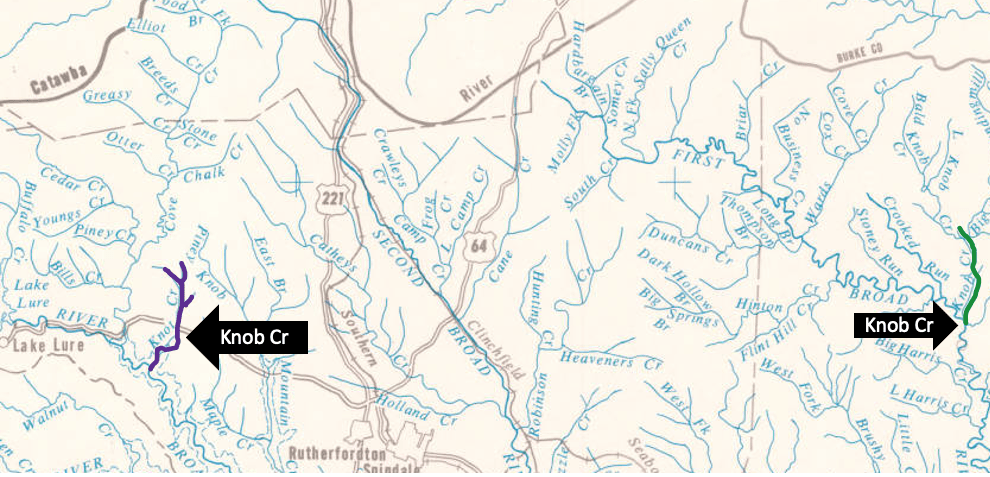 I have determined that he was living on “Knob Creek” in 1820; however, according to a map of the Broad River Basin, there are two Knob Creeks. One closest to Bill’s Creek (Bill’s Creek Baptist Church) off the Main Broad River and one closet to Lincoln County off the First Broad River.