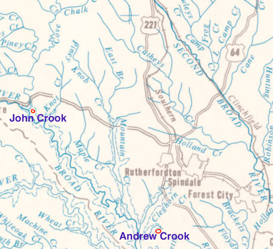 Andrew’s son, John Emmanuel Crook and his wife Rachel Haynes, (parents of Catherine “Katie” Crook) was already living in Rutherford County at the time. They are listed on the 1800 Rutherford Co. census (5 family members). The data on census correlates with the ages of family members who would have been alive during that time. John and Rachel were likely married sometime before 1790 in Rutherford County, NC.