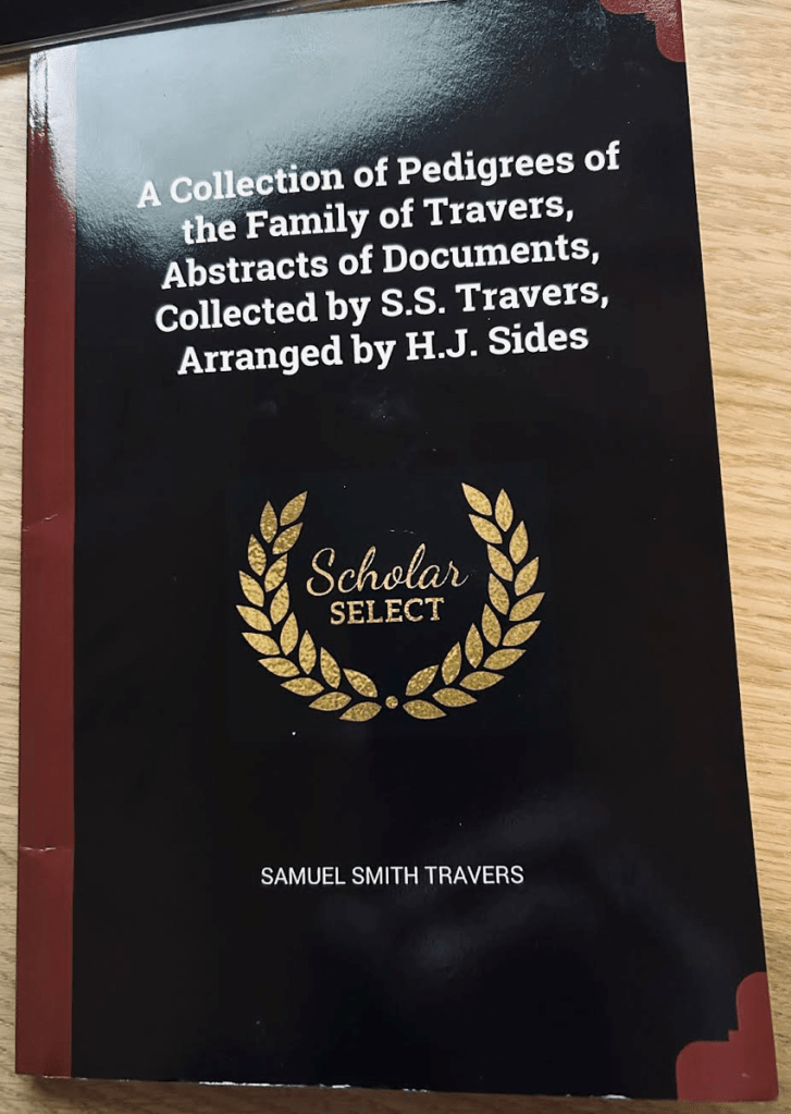 During the 1800’s, Samuel Smith Travers went about documenting the different Travers families and their lineages in an effort to create a complete family tree. His work was published in 1864, titled, A Collection of Pedigrees of the Family of Travers, Abstracts of Documents, Collected by S.S. Travers, Arranged by H. J. Sides.